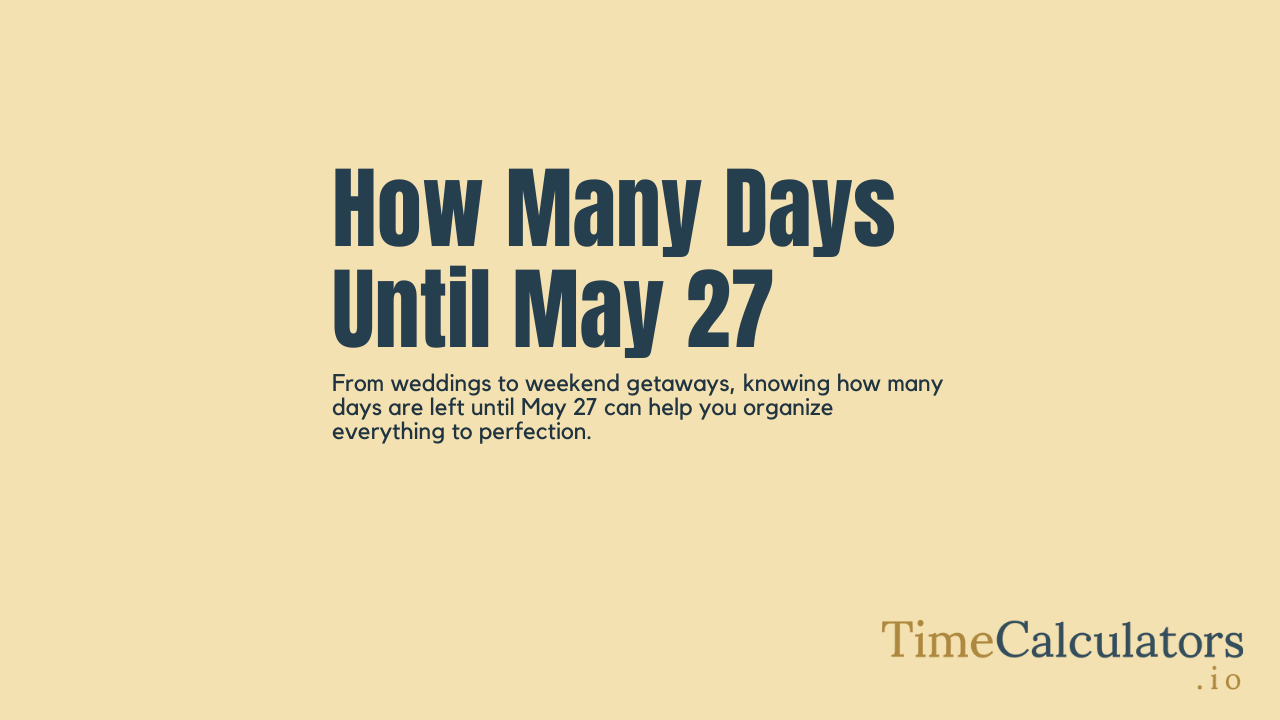The How Many Days Until May 27 Calculator is a lively real-time timer counting down to May 27 of the upcoming year, starting now. Want to know how many days are left until May 27th? As of today, there are left. Use our live countdown clock and calculator below to get the exact time or calculate from any date.