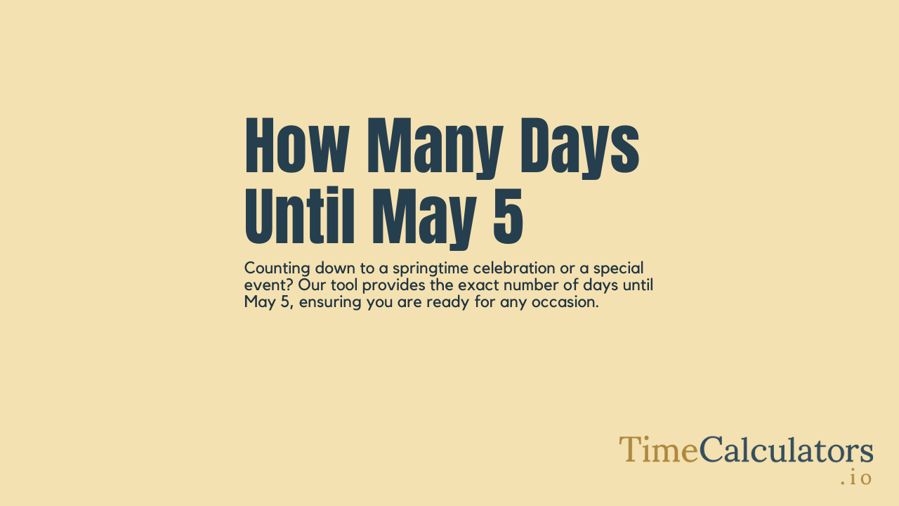 The How Many Days Until May 5 Calculator is a lively real-time timer counting down to May 5 of the upcoming year, starting now. Want to know how many days are left until May 5th? As of today, there are left. Use our live countdown clock and calculator below to get the exact time or calculate from any date.